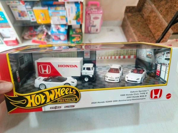 Celebrate Honda’s legendary automotive history with the Hot Wheels Premium Sakura Sprinter Gift Set, featuring four iconic vehicles in stunning detail: 1999 Honda Civic Type R, 2003 Honda NSX-R, 2020 Honda S2000 20th Anniversary Edition, and the Sakura Sprinter transport truck. Each model showcases authentic Real Riders wheels, premium metal bodies, and collector-level decos, making this set perfect for display or gifting. Officially licensed by Honda and manufactured by Mattel in Thailand, this 2025 release is a must-have for enthusiasts and collectors seeking rare, high-quality die-cast models